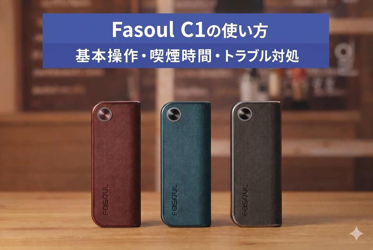 Fasoul C1は、専用スティックを挿してボタン操作するだけで使えるシンプルな加熱式デバイスです。この記事では、基本操作(挿入→起動→喫煙)と、喫煙時間(215秒/14パフ)よくあるトラブルと対処をまとめます。