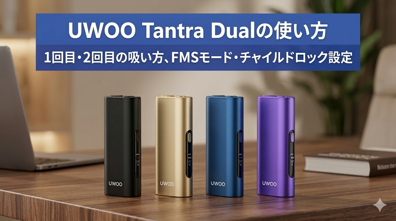 UWOO Tantra Dualは、新品スティック用の「1回目」と、シケモク用の「2回目」を1台で使い分けられる互換デバイスです。この記事では、基本操作から、FMSモード設定、チャイルドロック、喫煙時間、充電、喫煙本数カウントのリセットまで、迷わないようにまとめます。