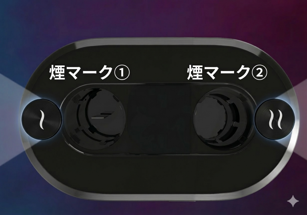 重要:煙マーク①は新品たばこスティック専用です。煙マーク①だけで2度吸いは行えません。 2度吸いは必ず煙マーク②側を使います。